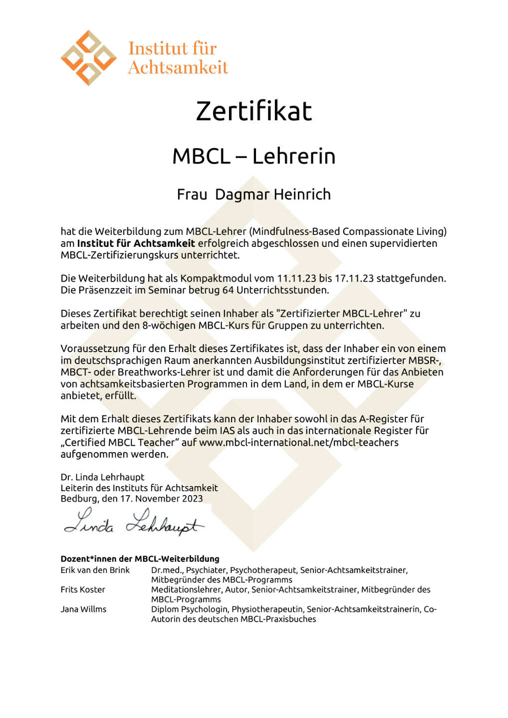 - MBCL-Lehrer-Ausbildung beim Institut für Achtsamkeit/ Dr. Linda Lehrhaupt